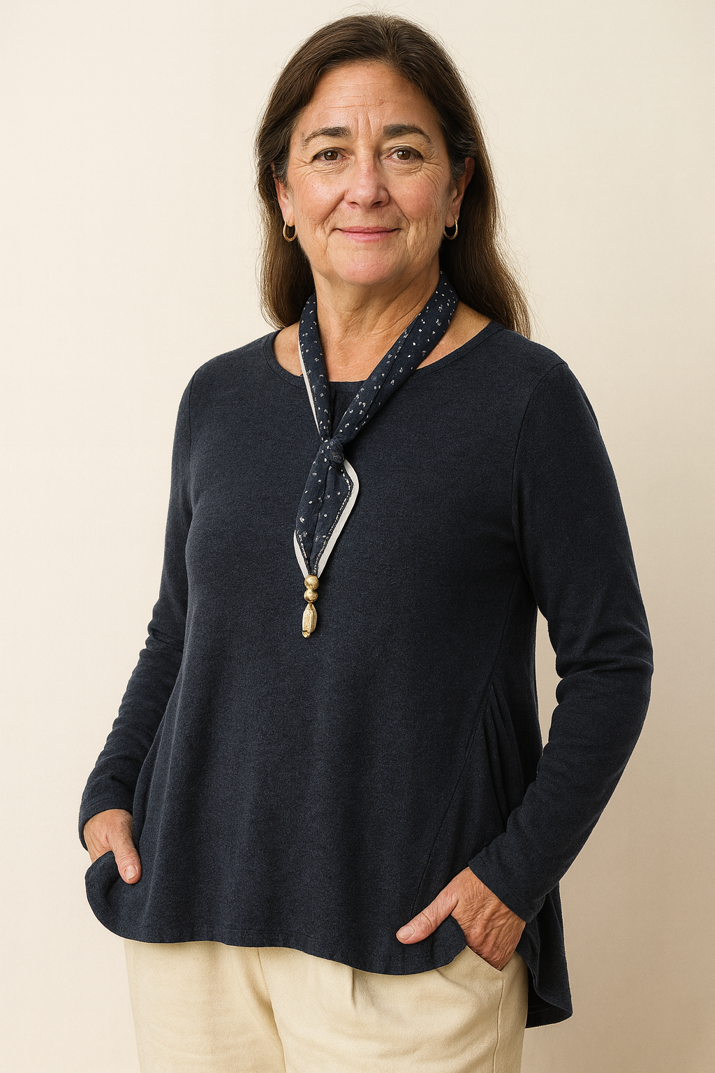 This long-sleeve top offers a simple, relaxed elegance designed for everyday comfort. The soft drape creates a flattering silhouette, with a slightly longer back hem that adds gentle movement and ease. Its clean round neckline and minimal detailing make it a versatile piece that pairs effortlessly with both casual and more polished outfits. Whether worn with comfortable trousers at home or layered under a cardigan for outings, this top provides a warm, understated look that feels as good as it appears.